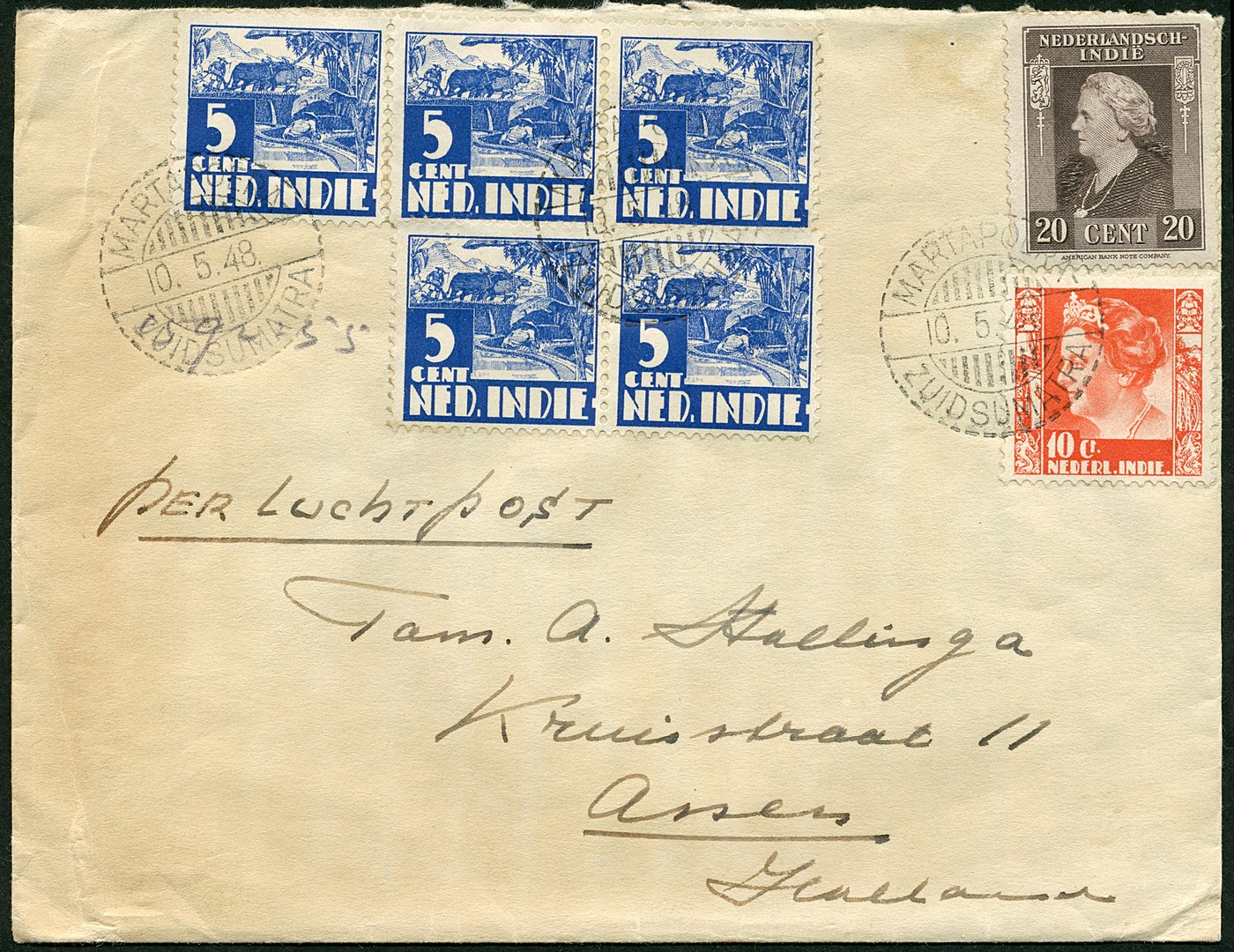 Env. van 15 gr. gefr. met 55 cent afgest. Martapoera-/Zuidsumatra 10-5-1948 (geen uurkarakters) naar Assen. Schaars!