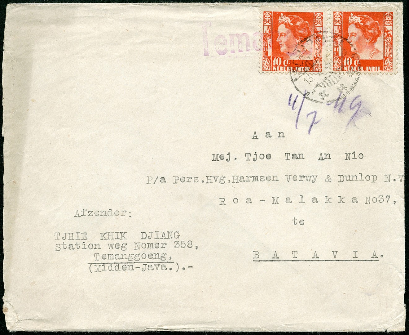 Env. gefr. met 2x 10c Kreisler afgest. in roodviolet met noodstempel ´Temanggoeng´ waaronder geschreven datum ´11/7-49´ over Semarang 13-7 naar Batavia. Zeldzaam!