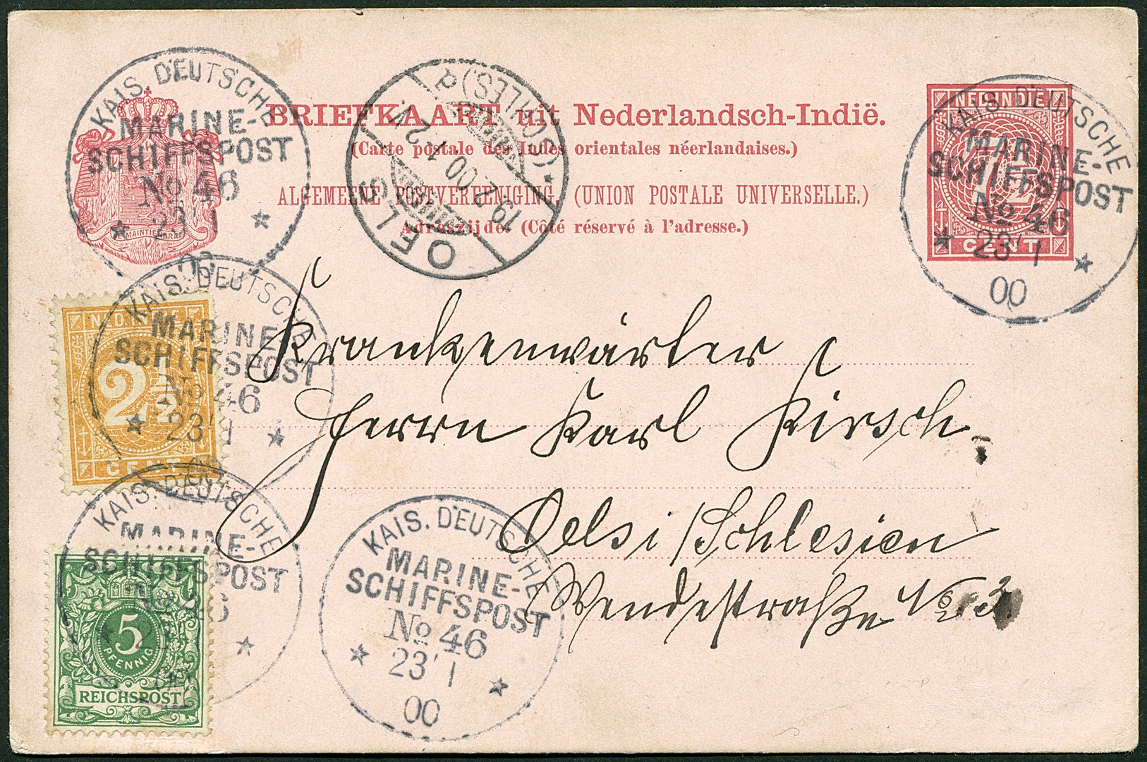 DUITSE MARINE ETC. IN AZIË. Bk. G12 bijgefr. met 2½c en 5pf door een opvarende van de SMS ‘Hansa’ die Batavia aandeed, prachtig afgest. ´Kais. Deutsche Marine-Schiffspost No. 46´ op 23-1-1900 en verz. naar Oels 19-2. Prachtkaart! Boeiend en gedocumenteerd artikel Han T Siem uit Filatelie april 2011 bijgevoegd