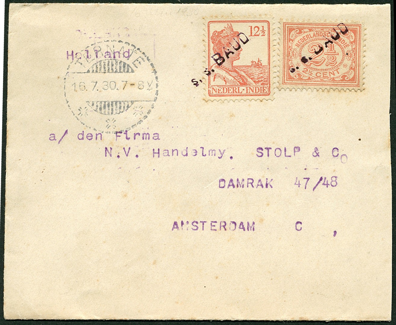 Env. ut Tobelo (Molukken) gefr. met 2½c en 12½c 2x afgest. met KPM-naamstempel ´s.s. BAUD´ via Ternate 16-7-1930 naar Amsterdam