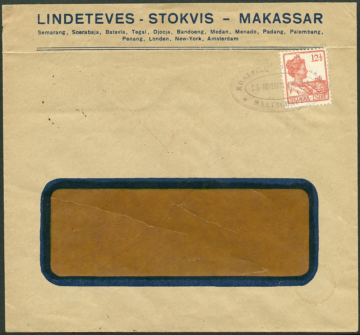 Bedrijfs vensterenvelop uit Makasser gefr. met 12½c licht afgest. met KPM-ovaalstempel ´S.S. GENERAAL MICHIELS´naar Samarinda 22-1-1933