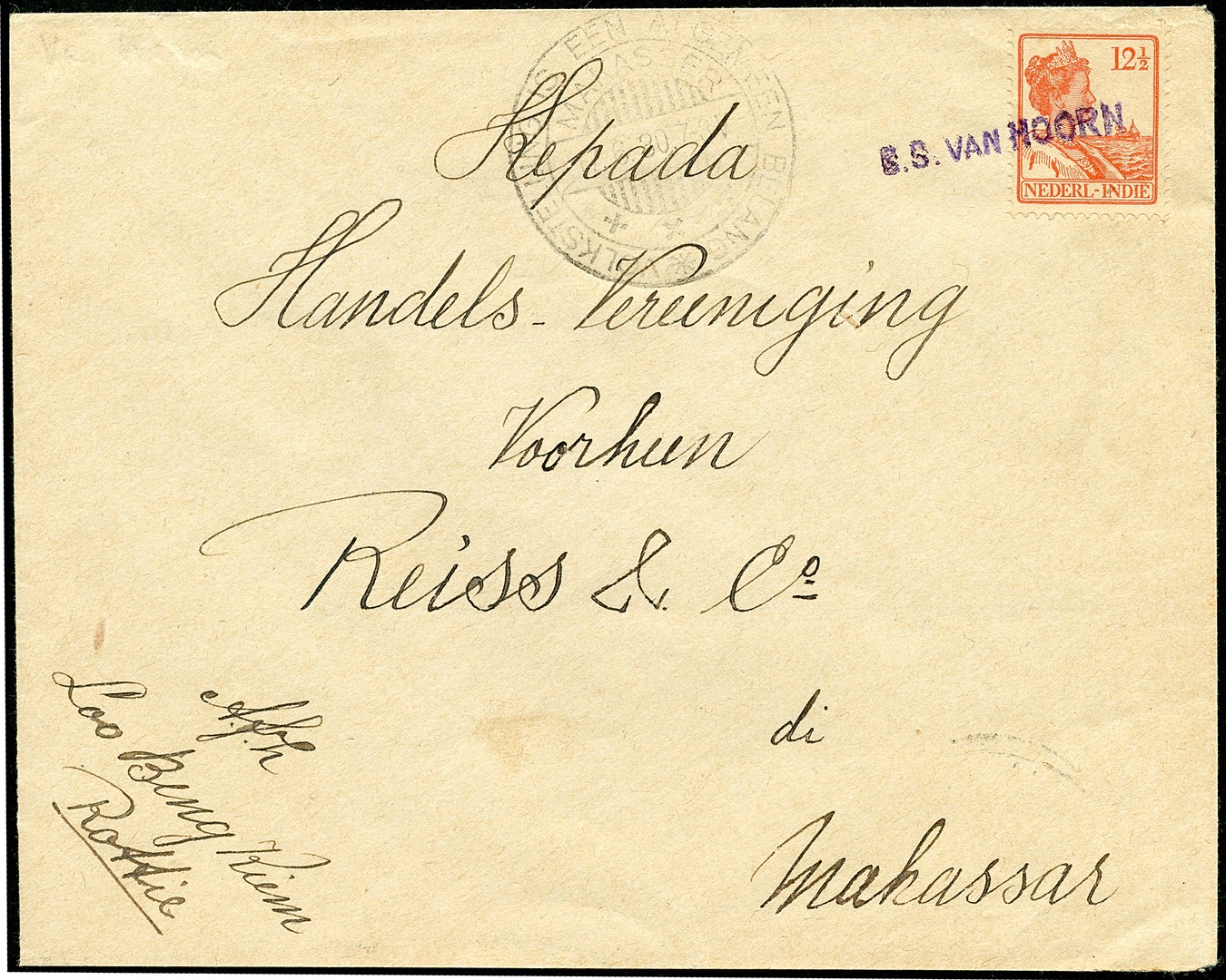Env. gefr. met 12½c afgest. met KPM-naamstempel ´S.S. VAN HOORN´ naar Makasser 17-6-1930