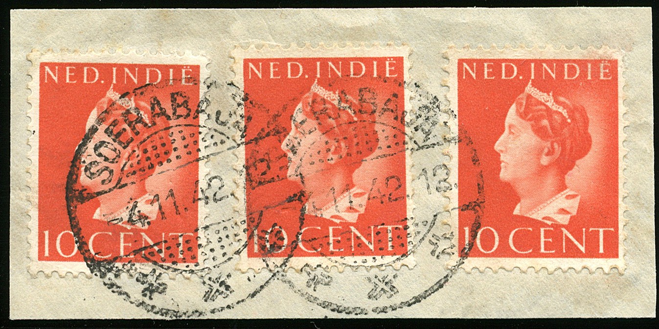 Java. 43bg, 10 cent Van Konijnenburg, three copies on piece cancelled Soerabaja -4.11.42.12. € 100