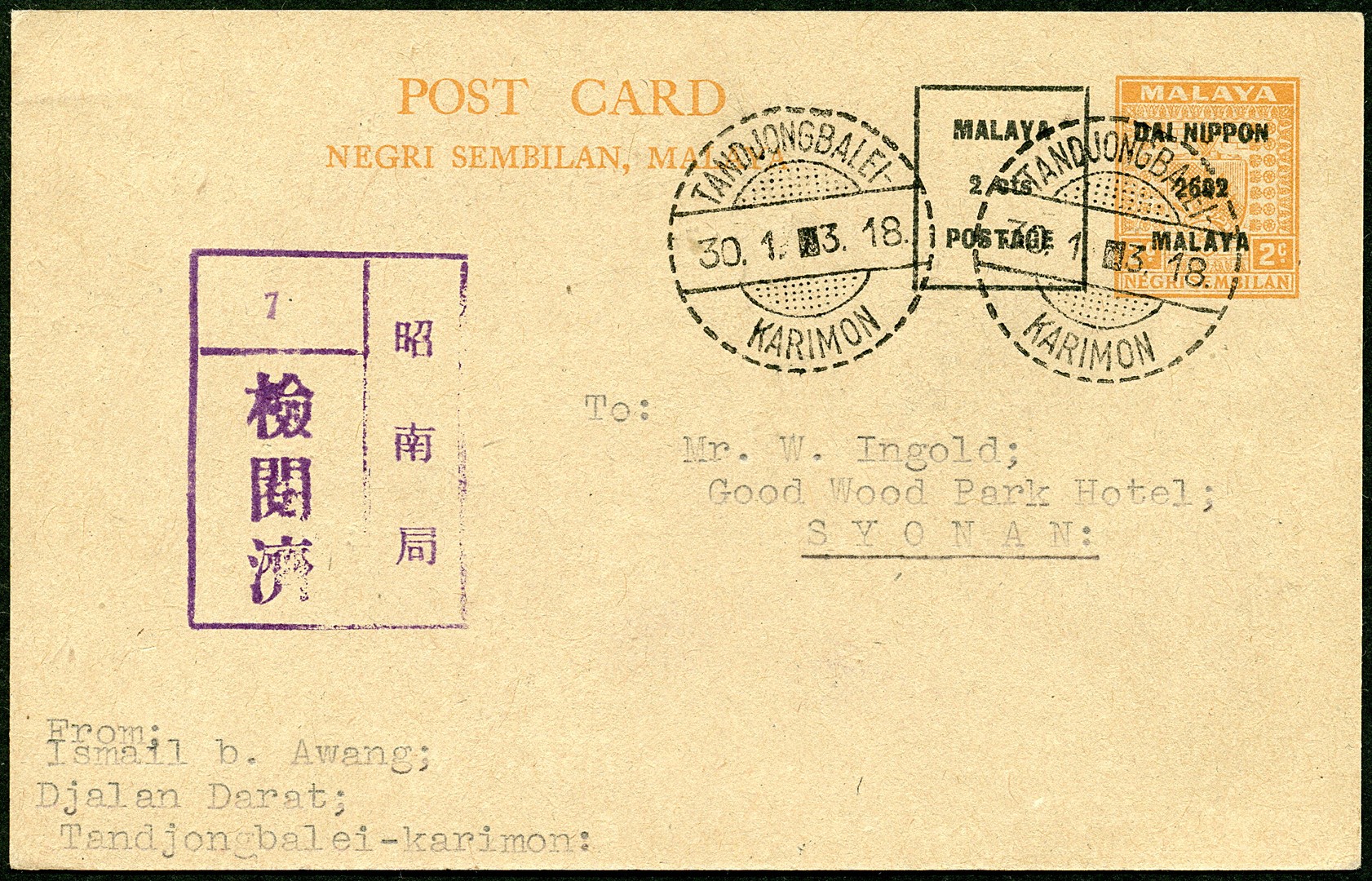Sumatra. Riouw Islands. 2c + 2c uprated Negri Sembilan postcard overprinted with Dai Nippon 2602 Malaya, Bu.191, sent from Tandjongbalei-/Karimon 30.1.3 (30 January 1943) to Syonan (Singapore), where the card was censored. Postcard in exceptional quality with two eye-catching strikes of the beautiful postmark (type 050). Exhibition piece!