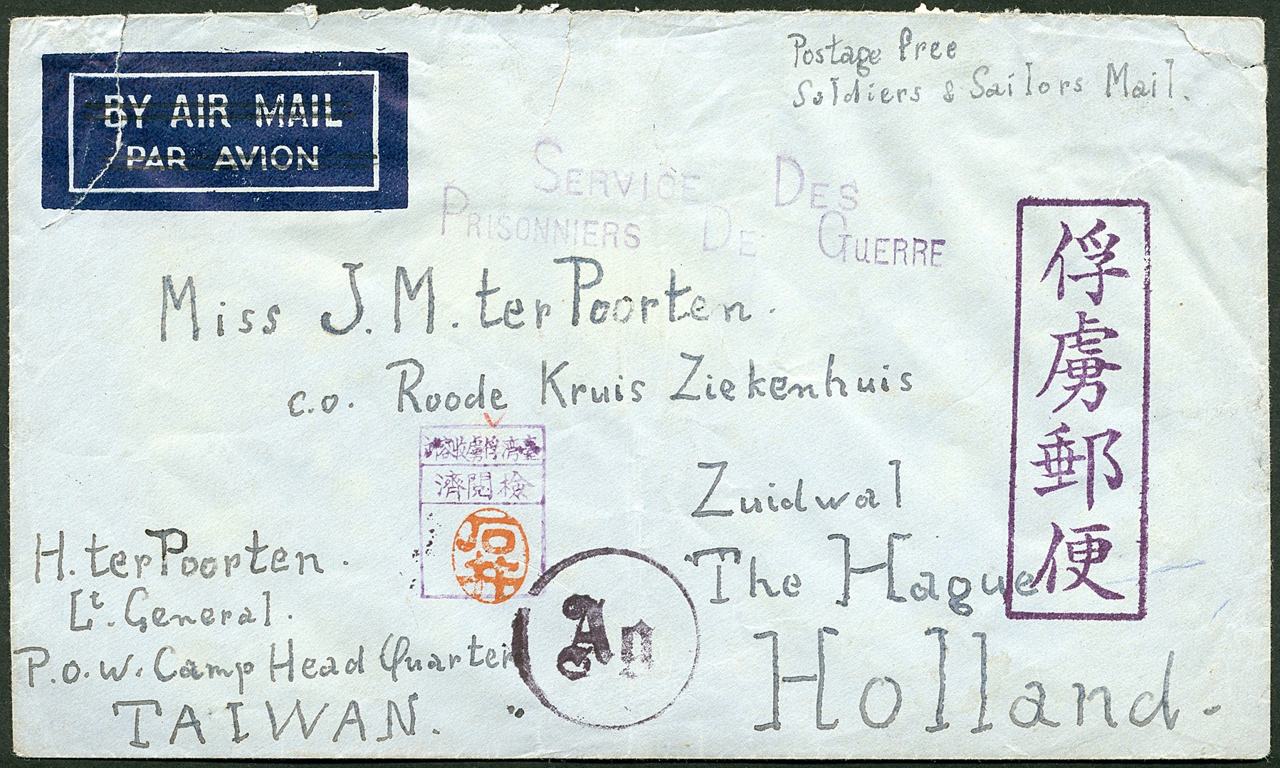 POW. Env. Bu.PW39 uit 1944 van Luitenant-Generaal Hein ter Poorten, ex commandant van het KNIL die op 8 maart 1942 de capitulatie tekende, krijgsgevangen in het Karenko-kamp (´generaalskamp´) in Taiwan, naar zijn dochter J.M. ter Poorten p/a RK-ziekenhuis in Den Haag. Japanse stempels voor krijgsgevangenenpost, censuur, ´Service Des/Prisonniers De Guerre´ en Duits censuurstempel Ag in cirkel. Unieke envelop met grote posthistorische en historische betekenis. Tentoonstellingsstuk. Ex Hiegentlich POW. Cover Bu.PW39 written by lieutenant general Hein ter Poorten, ex Commander in Chief of the Royal Netherlands East Indies Army, from the Karenko Camp in Taiwan (so-called ´Generals Camp´) to his daughter in The Hague, showing Japanese, international and German censor marks. Exhibition item of great philatelic and historical value