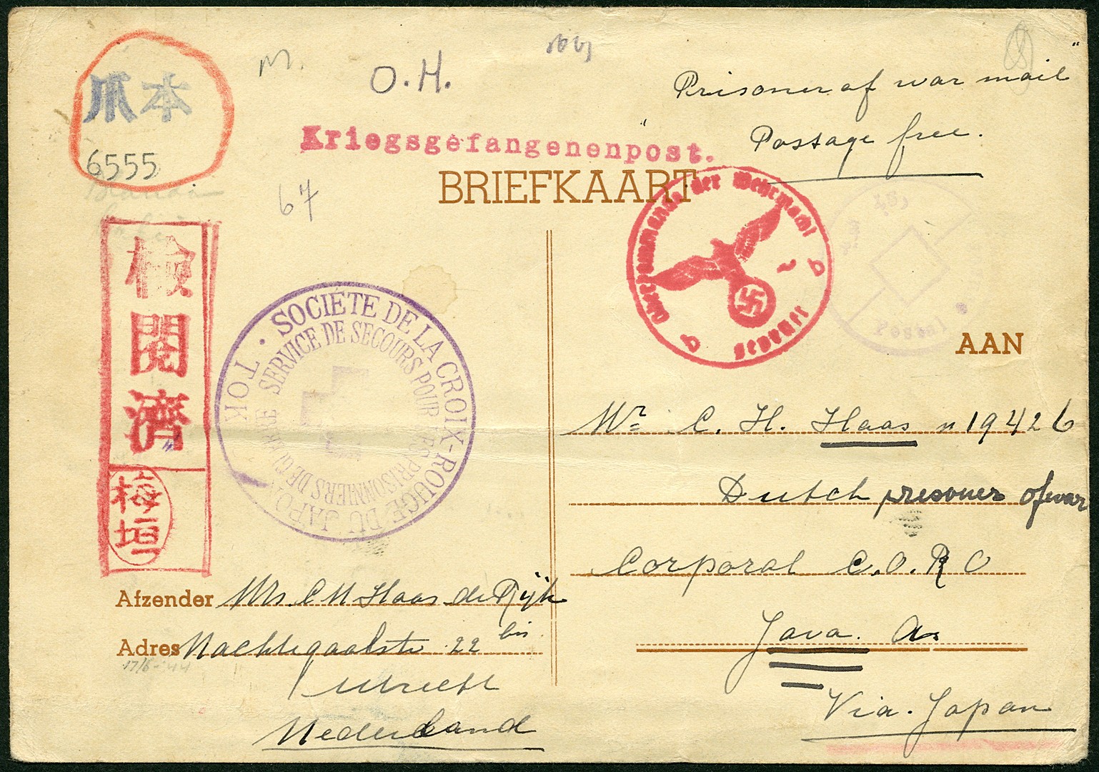 POW. Portvrij verz. bk. uit Utrecht 2-8-1943 door een moeder aan haar zoons in Java, over Berlijn, daar gecensureerd en gest. ´Kriegsgefangenenpost.´, ook in Egypte gecensureerd (lichtviolet censuurstempel) en via het Japanse Rode Kruis in Tokio, voorzien van POW-nummer 6555 en stempel ´Jawa Hon´ (= Java Algemeen), Bu.JC53b, omcirkeld, gecensureerd (censor Umegaki, zie Tett fig.2-12-103). POW. Dutch postcard written at Utrecht on Aug 2nd, 1943, from a mother to her sons somewhere on Java, via Berlin and the Japanese Red Cross at Tokio, with German, Egyptian and Japanese censors. Interesting route