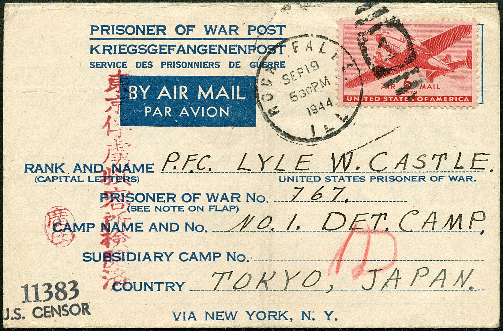POW. American lettersheet bearing 6c air mail from Rock Falls, Illinois, 19 Sep 1944 to a POW in Camp No. 1, Tokyo, with American and Japanese censors, and received on 21 Mch 1945