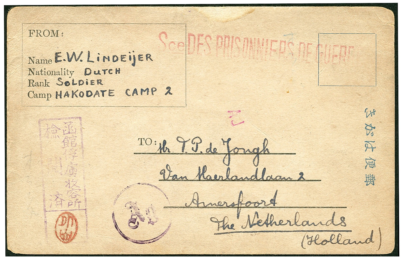 POW. Kaart Bu.PW25 geschreven op 4-11-1943 in het Hakodate Camp 2 in Japan door een soldaat die o.a. schrijft: ´We have hoped to see each other in ´41. Now I am already a year in Japan´. Verz. naar familie in Amersfoort. Japanse en Duitse censuren als ook ´Sce Des Prisonniers de Guerre´. Zeldzaam. POW card Bu.PW25 written on Nov 4th, 1943, to family in Amersfoort, showing Japanese and German censor marks. Rare