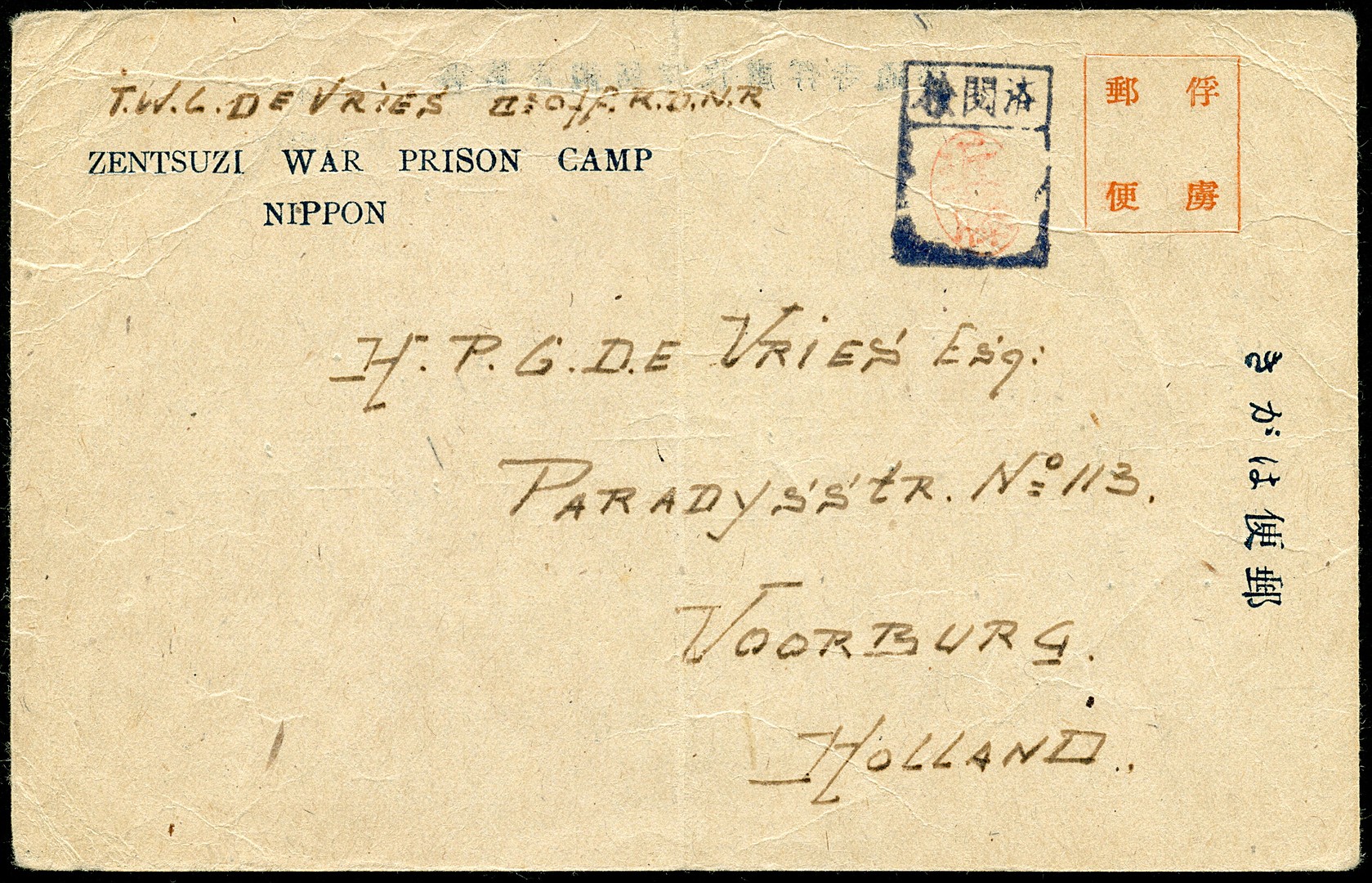 POW. Kaart Bu.29 geschreven in juni 1945 in het Zentsuzi POW Kamp in Japan naar Voorburg. Ex Hiegentlich POW card Bu.29 written in June 1945, sent from the Zentsuzi POW Camp in Japan to Voorburg