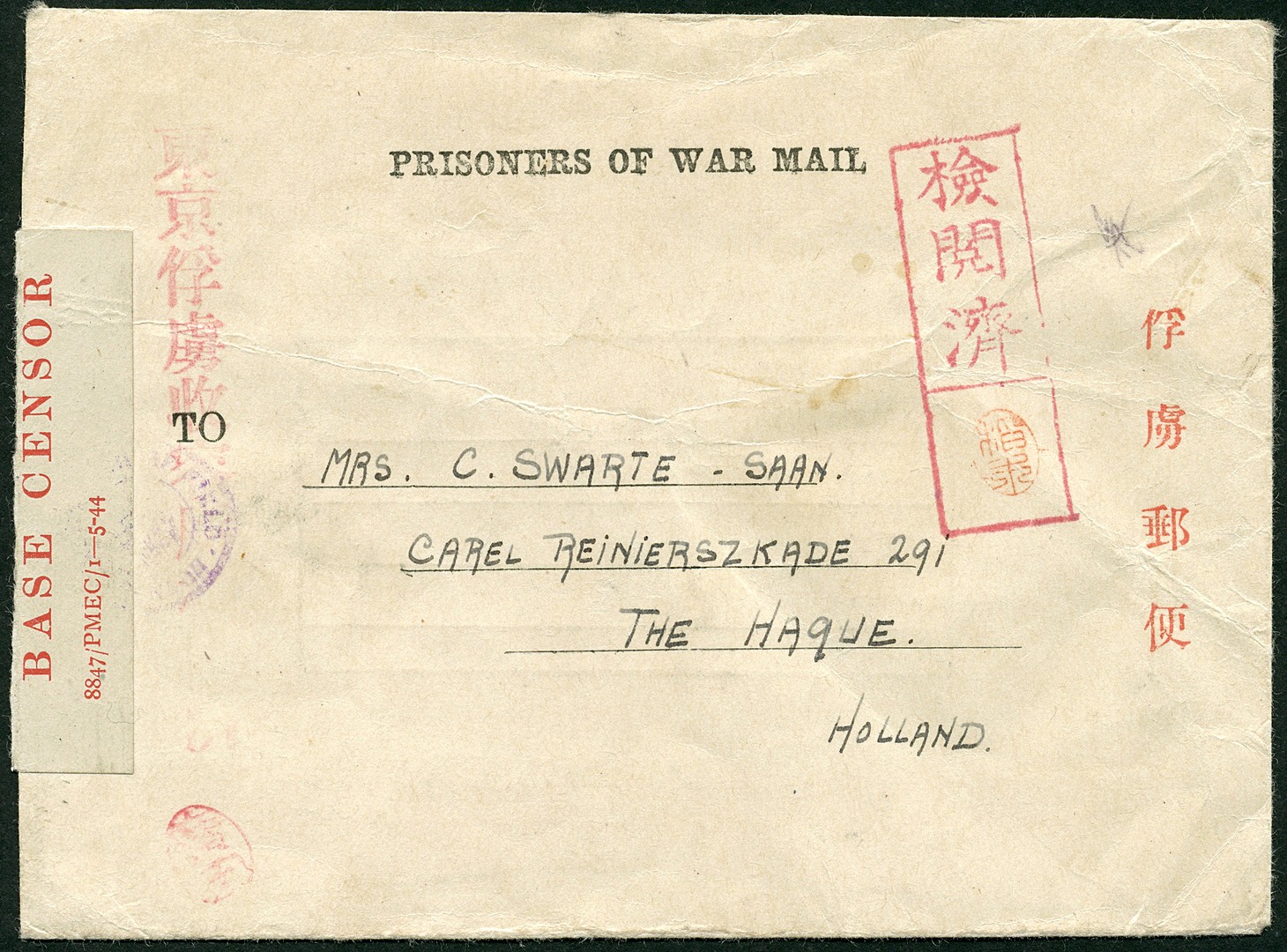 POW. Envelop Bu.PW32 met erbij behorende deels voorbedrukte brief geschreven op 5-9-1944 in een POW kamp in Tokio, naar Den Haag met Japanse censuurstempels en Britse censuurstrook met violet veldpoststempel. Ex Hiegentlich POW envelope Bu.PW32 including original partly printed letter written on Sep 5th, 1944, in a POW camp in Tokio, to The Hague, showing Japanese censors and British censor label and in violet a field postmark