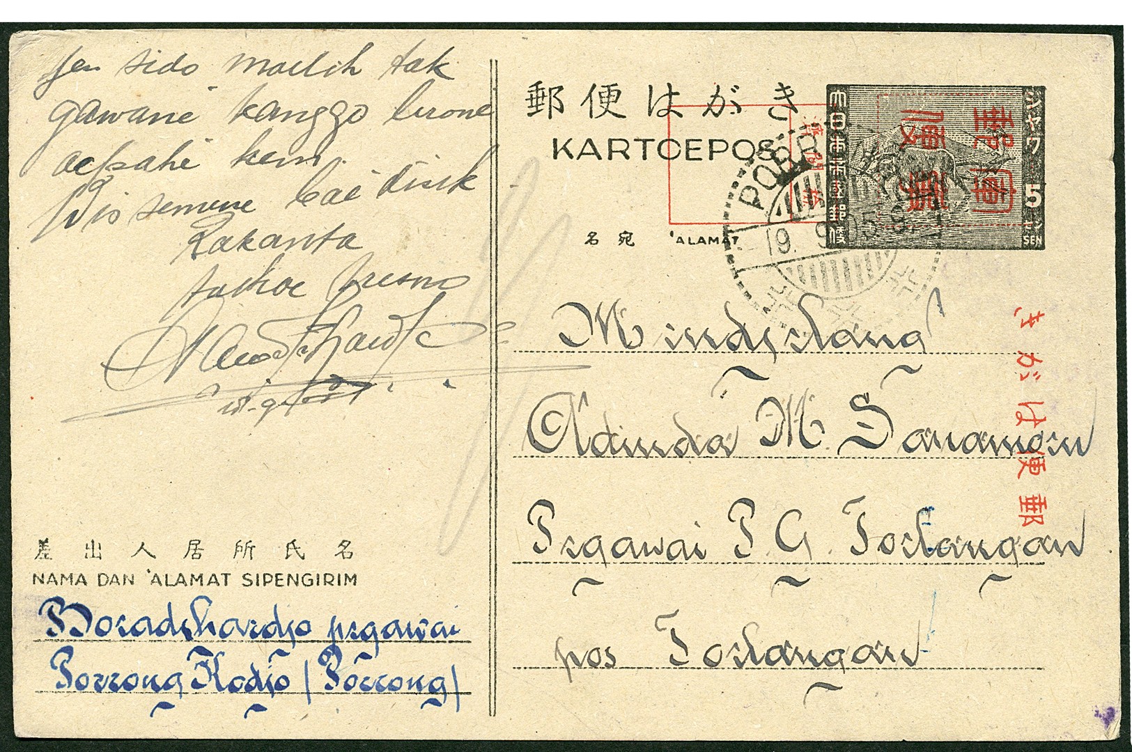 Java. 5 Sen postcard Bu.9 (€ 150) cancelled Porrong 19.9.05.8. to Toelangan. Very rare pmk (vNV.RR)