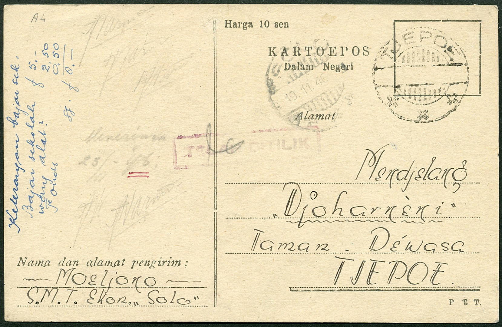 Java. Postcard Bu.RJ12 showing Tjepoe validation mark, from Solo 19.11.46 to Tjepoe