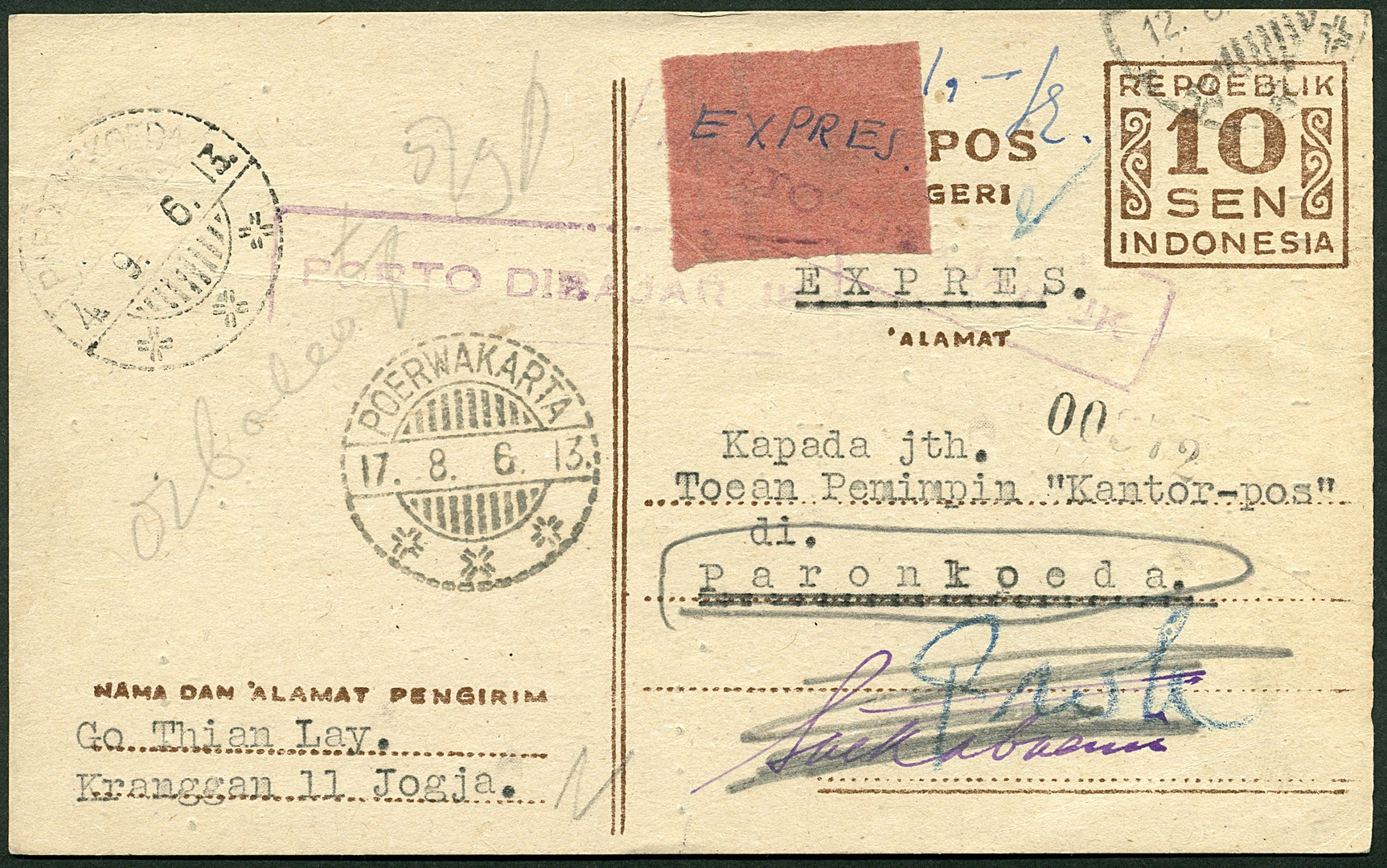Java. 10 Sen postcard with ornaments Bu.RJ15 bearing provisional express label, writte ´1,-´ and cancelled twice ´PORTO DIBAJAR DJK´ from Djokjakarta 12.8 from Paroengkoeda to Poerwokerto 17.8.6 (Hari Merdeka), returned on 4.9. Same postcard (crease) with open bar pmk Tjirebon, from Tjirebon 26.12.46 to Soekaboemi
