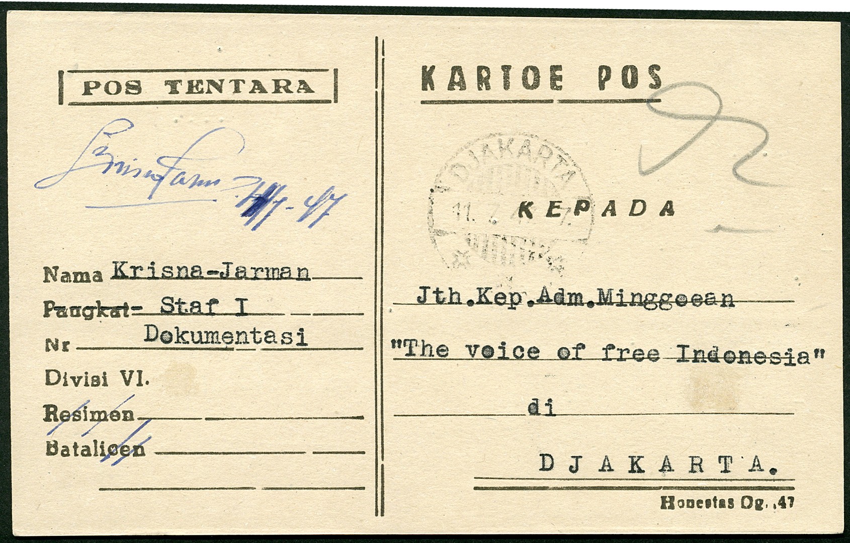 Java. Pos Tentara. Field post card Bu.T7b to Djakarta 11.7.47. Scarce and in very fine quality!