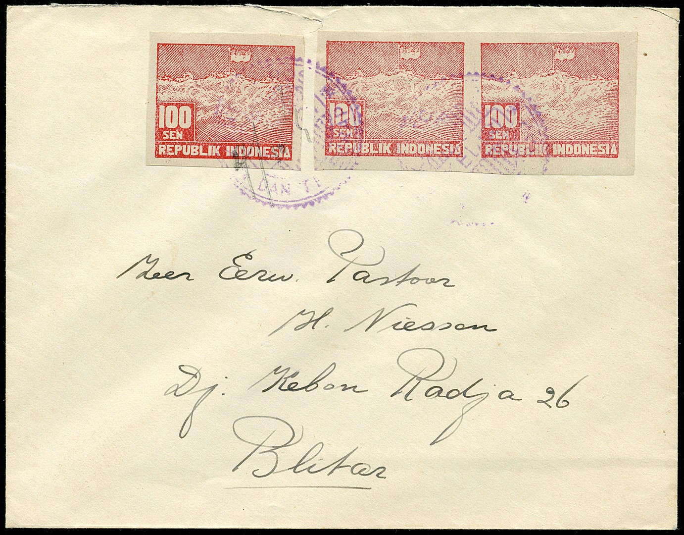 Java. 100 Sen 046A (3x) on cover (sender A. v. Rijnsoever, Dj. Klotok 3, Kediri, Java) tied twice in violet by a most unusual provisional postmark 'KANTOR POST/DAN TELEGRAP/KEDIRI' with written date in the left cancellation, a hardly readable 4/10/5 (1950?), sent to a pastor at Blitar. See vNV type 111 on pages 56, 287. The only one recorded and a most desirable item for any exhibition collection of the Republik of Indonesia!