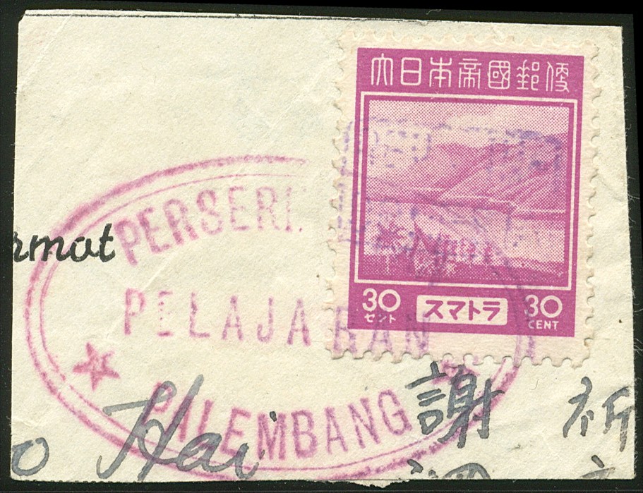 Sumatra. Violet-red oval cachet ´Perserikatan/Pelajaran/Palembang´ (= Palembang Shipping Society) on 54v-88 on piece. The Palembang Postal Services Authorities gave permission to this society to take care of the carriage of mail to Singapore