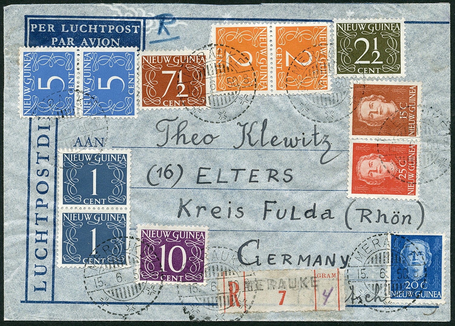 Aantrekkelijke kleurrijk gefr. luchtpostcouvert van 4 gr. aangetekend van Merauke 15-6-1950 naar Fulda-Land 7-7, met R-strookje uit de Ned.- Indische tijd