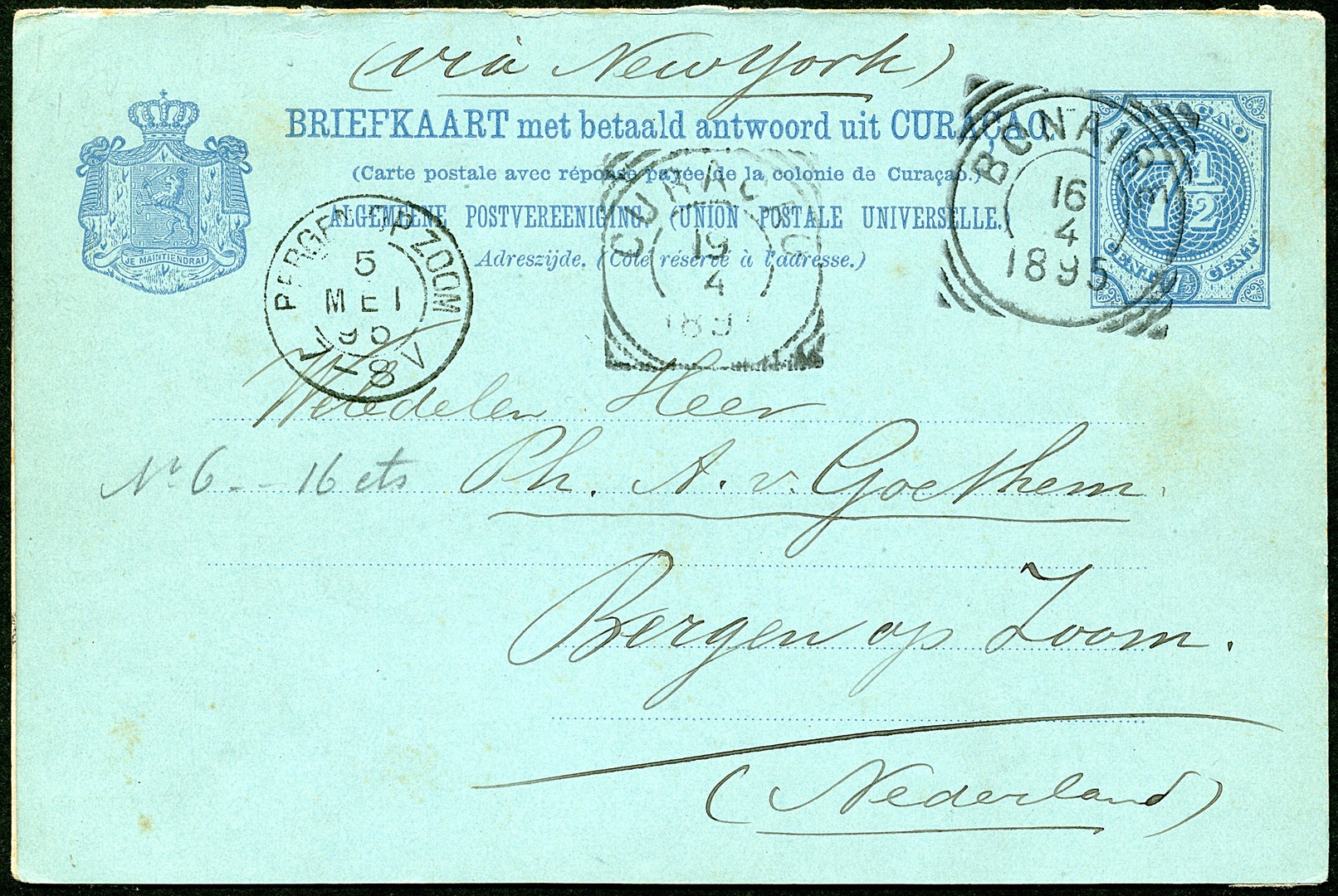BONAIRE (JB. type Ia) op twee minder mooie dubbele bk. G14 van 8-8-1894 (niet beschreven) resp. 16-4-1895 (V- en A-kaart beschreven) over Curaçao naar Bergen op Zoom 20(?)-7-1894 resp. 5-5-1895
