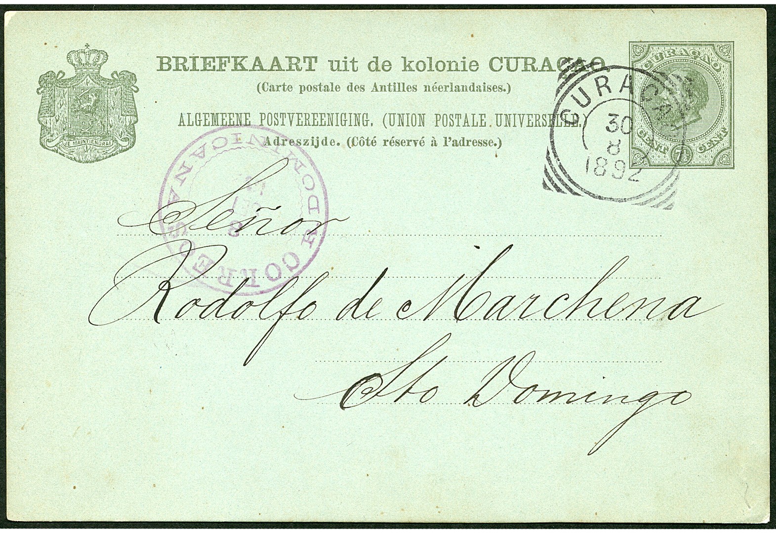CURAÇAO op bk. G8 van 30-8-1892 naar Santo Domingo 3-9