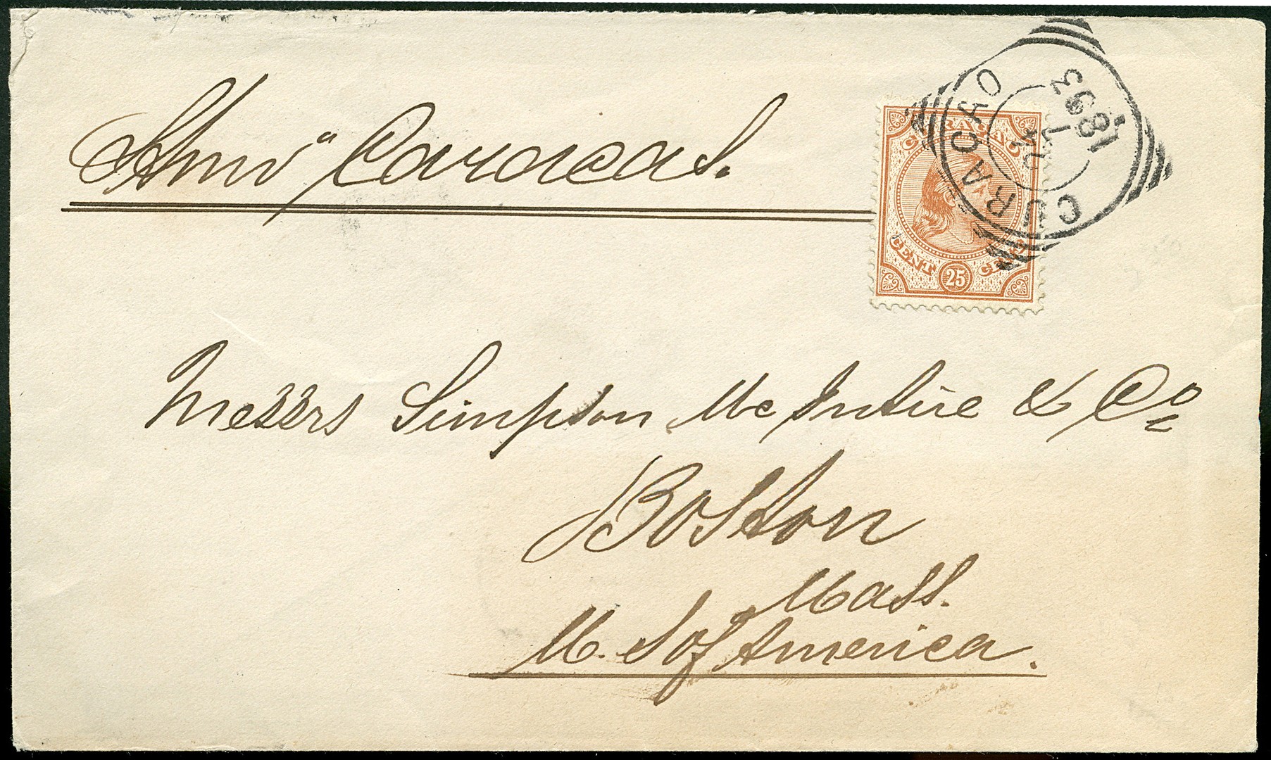 CURAÇAO op zeer frisse env. gefr. met 25c nr. 22 als enkelfrankering van 24-7-1893 over New York 31-7 naar Boston 31-7