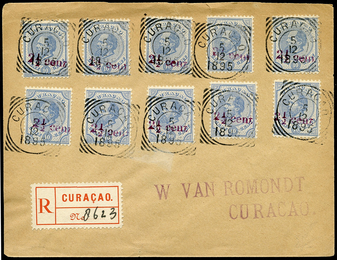 CURAÇAO (JB. type VII) op bk. G7 (scheurtje) van 3-2-1896 en op env. gefr. met tien ex. 2½c op 10c nr. 24 van 5-12-1895 (JB. RR op zegel en onbekend op poststuk, zie blz. 132)