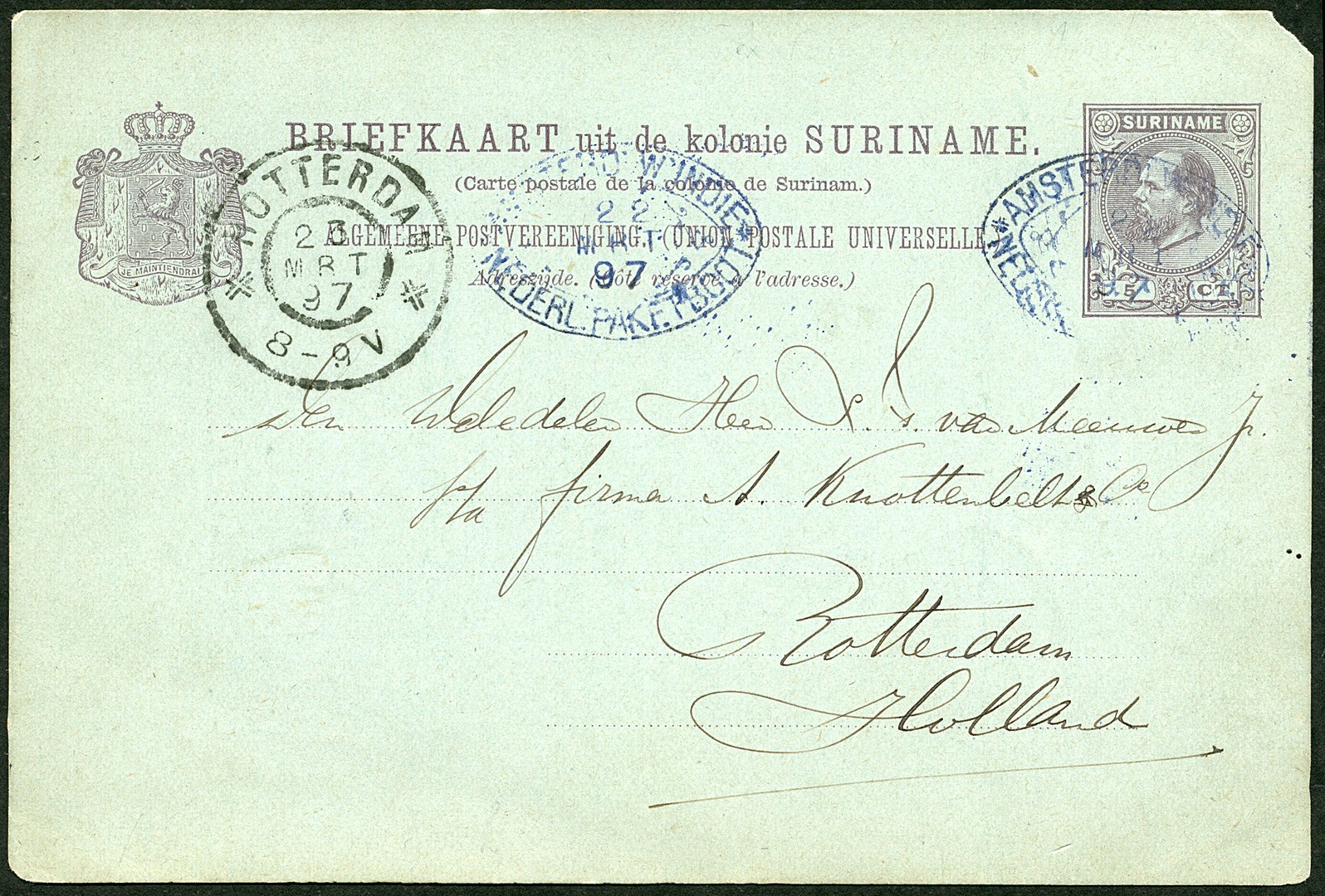 Bk. G9 (mist hoekje) op 27-2-1897 geschreven op het Fort Nieuw Amsterdam, afgest. met KWIM-ovaalstempel 22-3 in blauw, naar Rotterdam 23-3