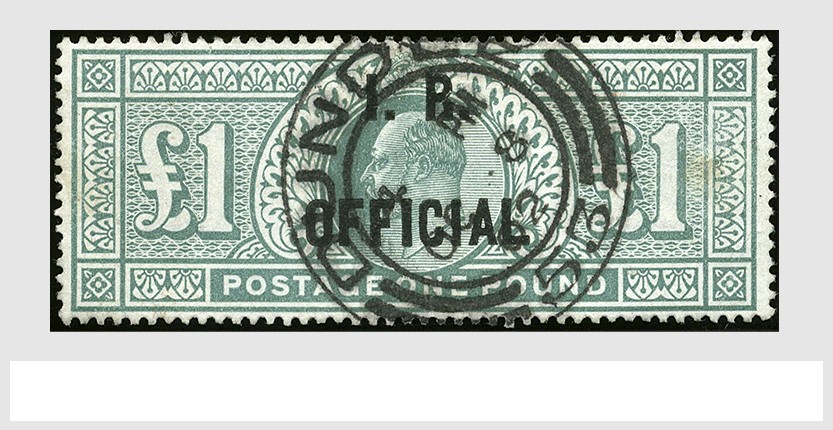 ENGELAND, Dienst S.G. O.27, 1 Pound dull blue green, gebruikt vrijwel pr.ex. goed gecentreerd en met mooi vol stempel 'Dundee 1902', met cert. RPS (2017) met lichte bemerking "surface abrasion at right, due to reduction of staining". Zeer schaars zegel, cat.wrd. £.25.000!