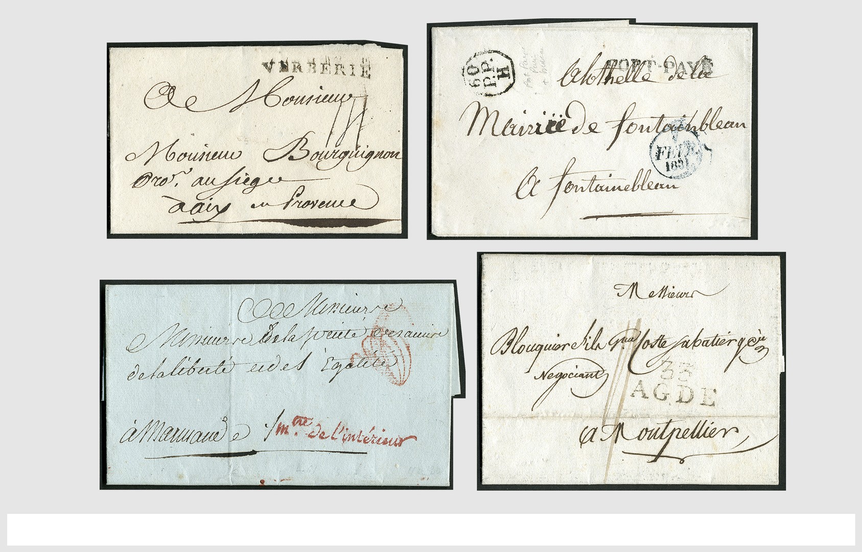 FRANKRIJK POSTHISTORIE, tentoonstellingscollectie ´De Post in Frankrijk voordat er postzegels waren´ van 45 poststukken 1701-1849 met een verscheidenheid aan stempels, portvrijdom, bestemmingen, etc. alles keurig en gedocumenteerd beschreven op bladen