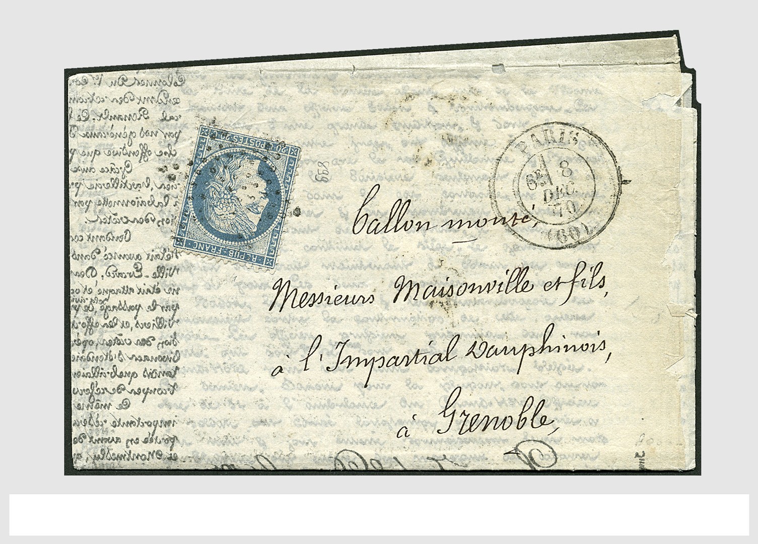 FRANKRIJK, BALLON MONTÉ. Correspondance Havas, Édition Française van 8-12-1870 gefr. met 20c Yv.37 van Paris 8-12 opgestegen met de Général Renault, verzonden naar Grenoble 21-12. ? 1000+