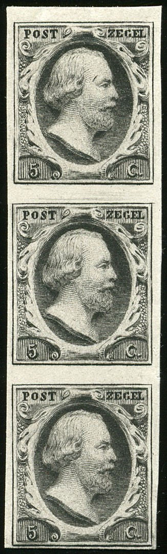 Zwarte zegelafdruk van de goedgekeurde plaat I op dik wit kartonpapier, zonder watermerk, ongetand. Gecatalogiseerd als PC.9. Verticale strip van drie, pos. 3/8/13. Mooie strip, zegels fris van kleur, onderste rand iets smal, overigens prachtig gerand