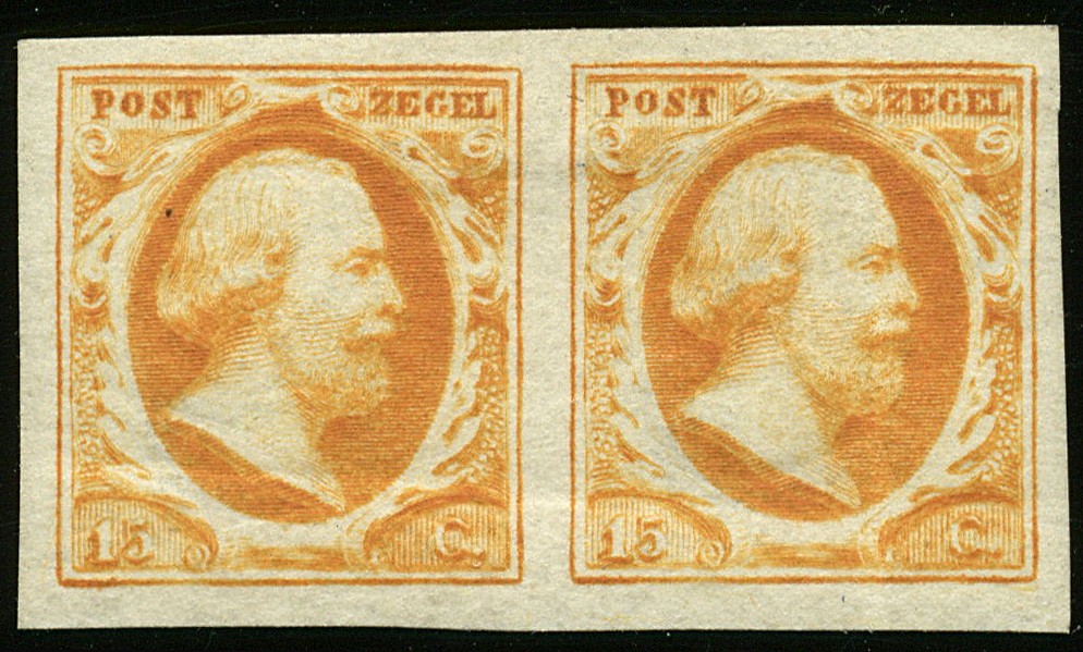3a, 15 cent donkergeeloranje, pos.43/44 (?), breed gerand prachtpaar met volle originele gom (waarin 2 gomvouwen), zeer fris van kleur. Cert. C. Muis (1977) € 2400 +