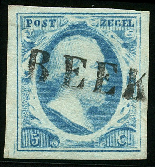 BEEK in grote letters en zwart (EY.RR) op 5 cent. Prachtex. met volledige afst. Zeldzaam!