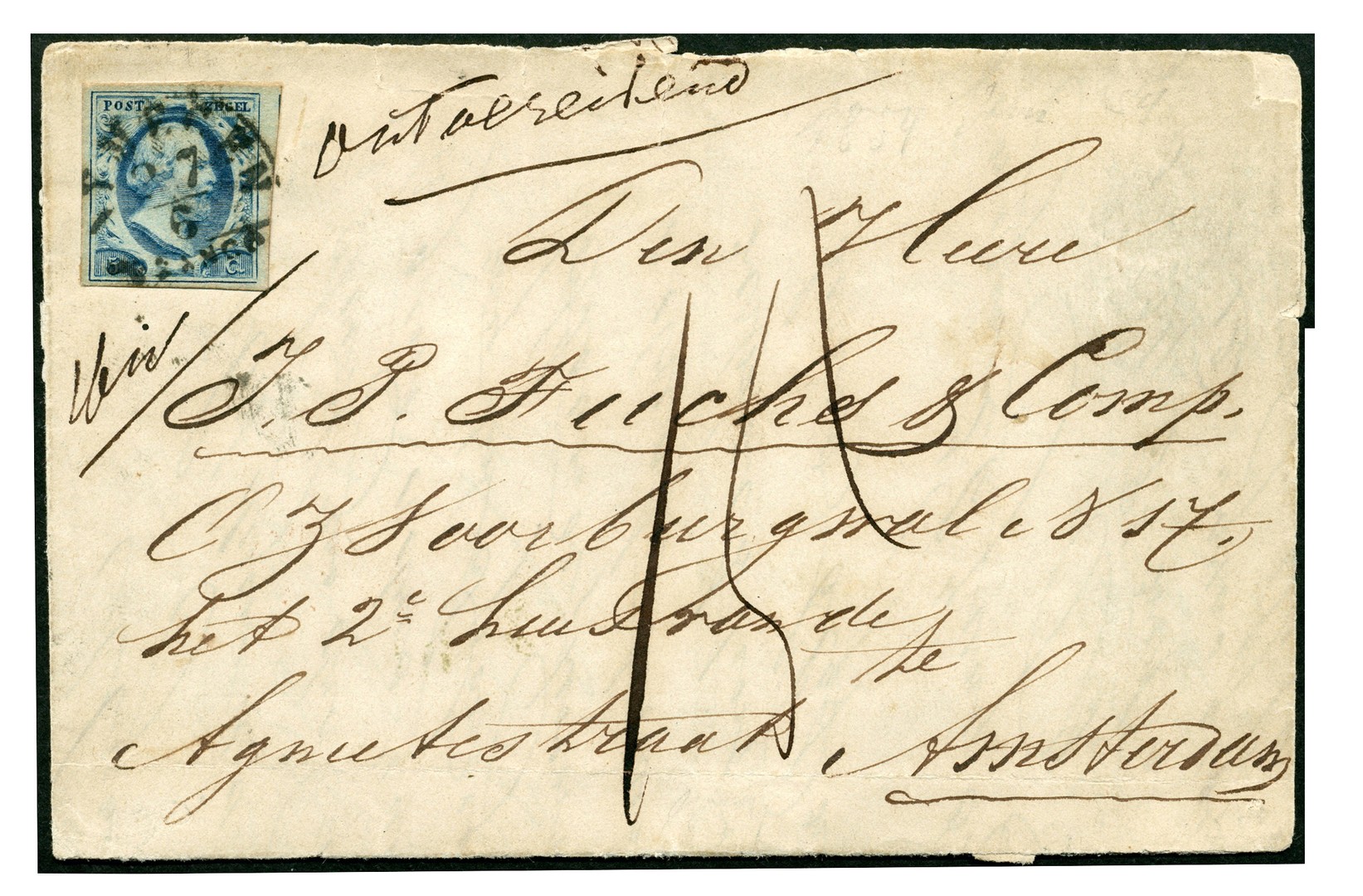 NYMEGEN A (EY.50) op 5 cent nr. 1f-Pl.II. Prachtex. op vouwbrief (az. iets los) van 27-6(-1854) naar Amsterdam 27-6, waar de ontvanger nog 15 cent moet betalen voor deze ontoereikend gefr. brief, 5 cent omdat het gewicht 16w is (dus 2e gew. kl.) plus 10 cent omdat de afstand meer dan 100 km bedraagt