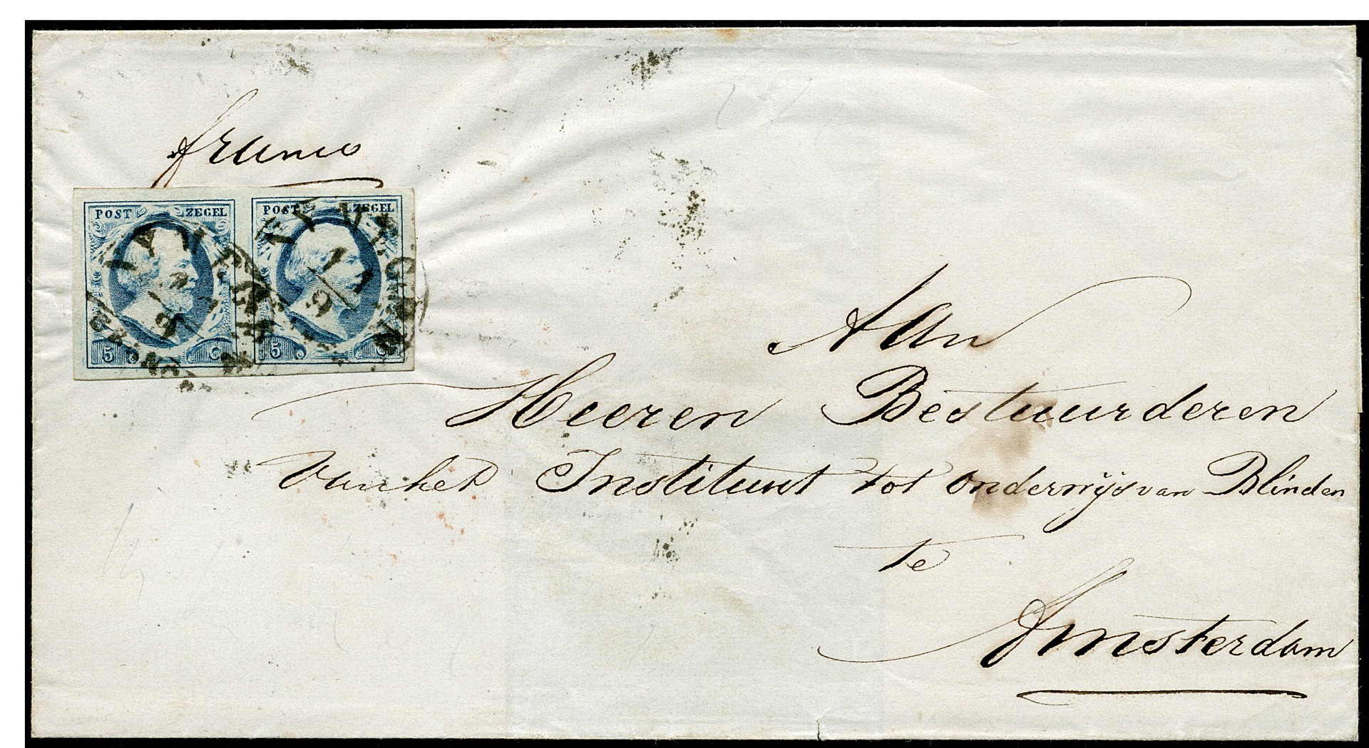 NYMEGEN A (EY.50) op 5 cent nr. 1f-Pl.II. Breed gerand prachtpaar op briefomslag van Wychen (az. naamstempel) over Nymegen 11-9 naar Amsterdam 11-9-1855 met tevens bestellersstempel 28