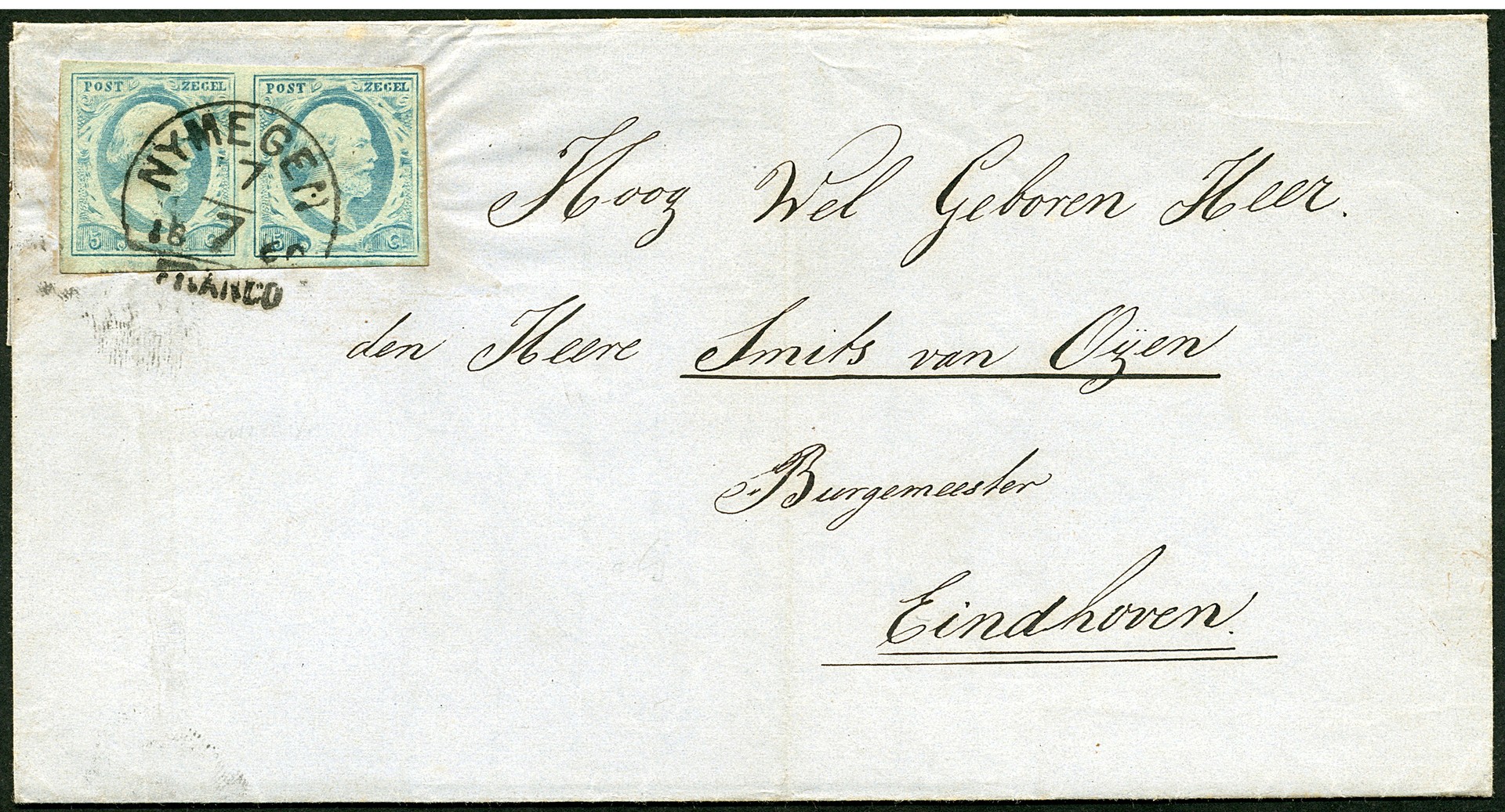 NYMEGEN C klein (EY.75) op 5 cent lichtblauw. Redelijk tot mooi gerand paar met prachtige, centrale afst. op frisse, complete vouwbrief geschreven te Alphen 16-7-1860 via Appeltern (az. naamstempel) over Nymegen 17-7 naar de burgemeester van Eindhoven 17-7