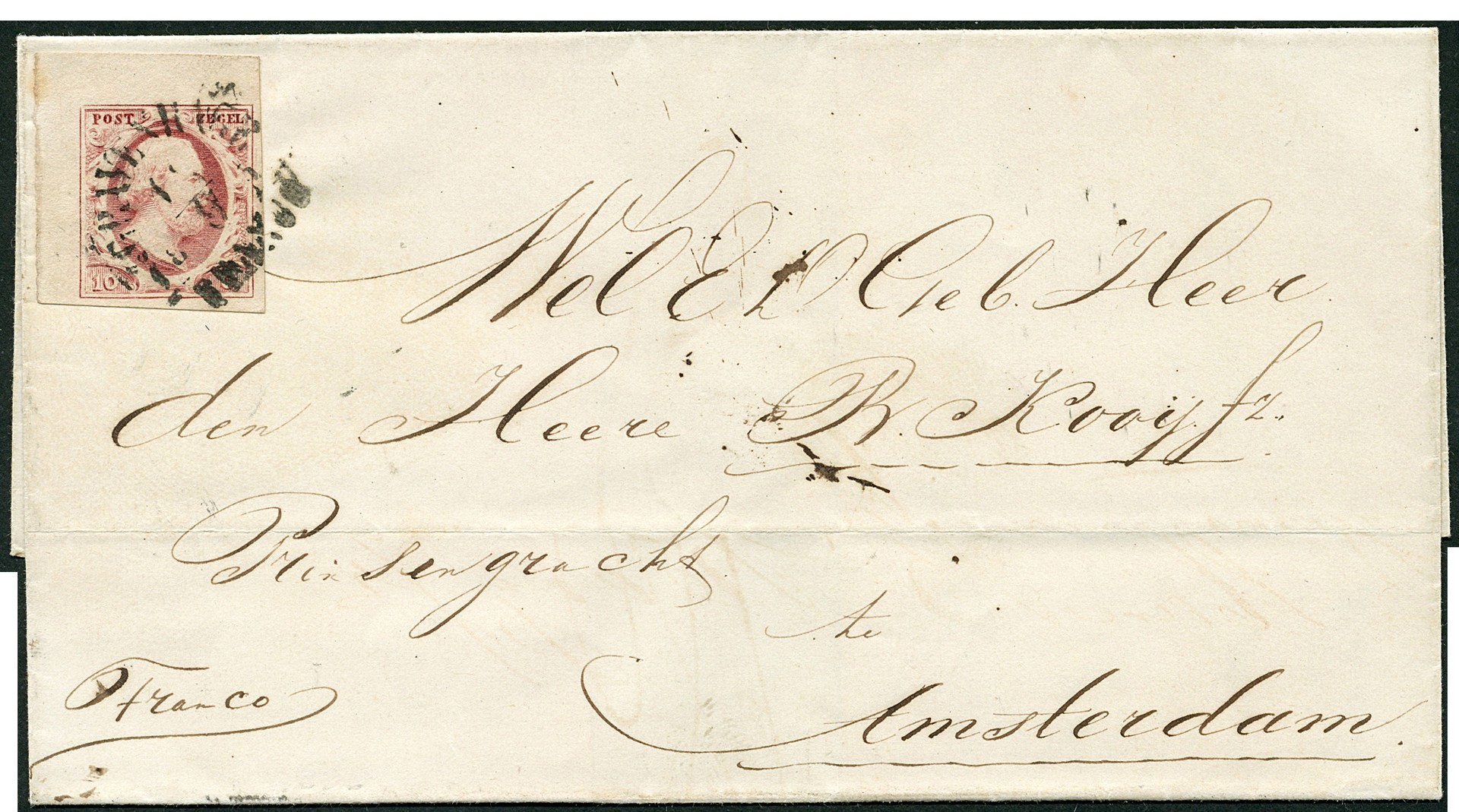 10 Cent nr. 2b-Pl.I-76. Zeer breed gerand pracht hoekstuk op frisse briefomslag van ´sGravenhage 18-9-1852 naar Amsterdam 18-9