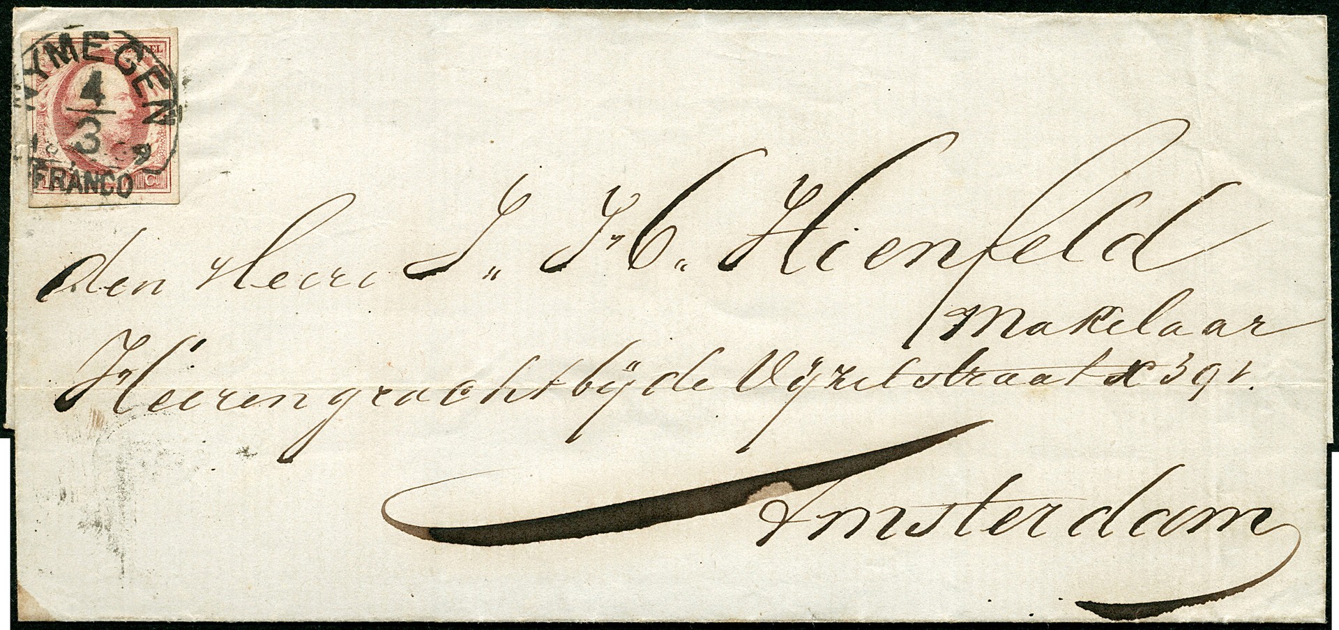 NYMEGEN C groot (EY.50) op 10 cent. Aan drie zijden breed gerand prachtex. op mooie briefomslag van Mook (az. naamstempel) over Nymegen 4-3-1859 naar een makelaar te Amsterdam 4-3. Ex Berghuijs
