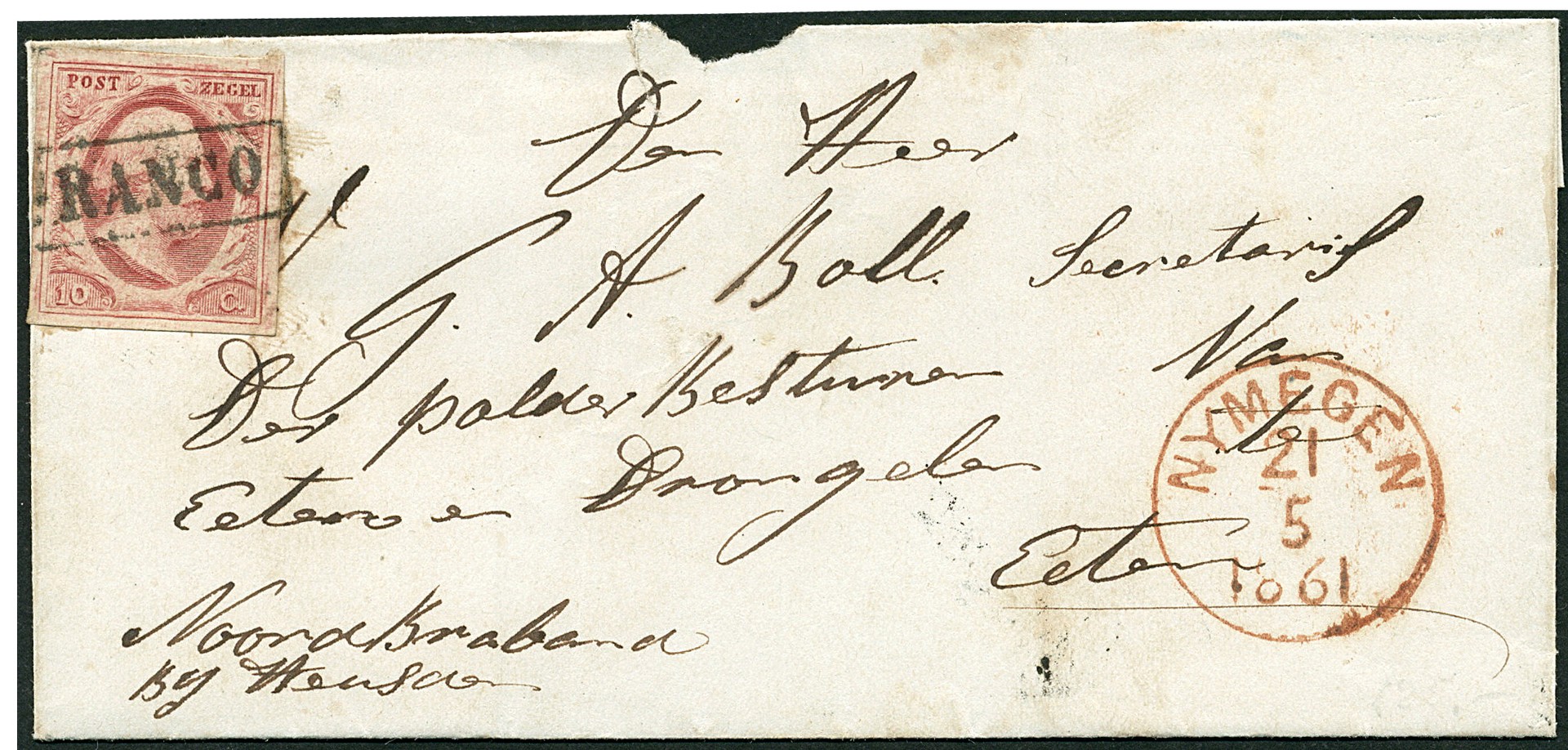 10 Cent nr. 2j-Pl.V (prachtex.) op briefomslag van Winssen (az. naamstempel) over Nymegen 21-5-1861 via Heusden 22-5 (az. superbe rondstempel) naar het polderbestuur van Eeten en Drongelen te Eeten (Eethen)