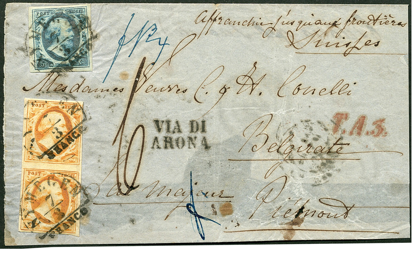 NYMEGEN A op 5 cent nr. 1a-Pl.I-13 (EY.50) en 15 cent nr. 3b pos. 79/84 (EY.175). Prachtex. resp. prachtpaar op zeer groot briefdeel van 7-3-1852 o.a. over Deutz-Dulsburg 8-3 en Omegna 15-5 ´Via di/Arona´ naar Belgirate in de regio Piedmont aan het Lago Maggiore, met op vz. in rood ´T.A.3.´ (Transit Autrichien 3eme prix) en div. notities w.o. de opmerking dat port betaald is tot de Zwitserse grens. Volgens notitie bedroeg het tarief naar Italië via Zwitserland 35 cent van 1-1-1852 tot 1-1-1853. Zéér vroege gefrankeerde brief naar het buitenland. Bijzonder zeldzaam, uitgebreide documentatie bijgesloten. Ex Clifford-Jones