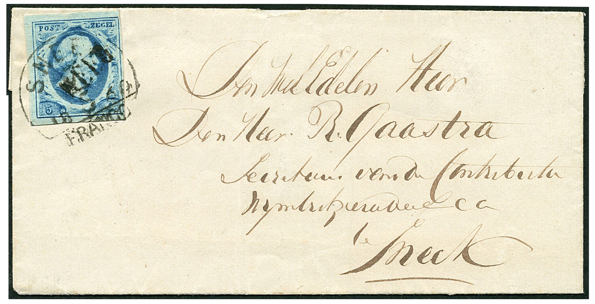 HEEG (EY.250) op 5 cent nr. 1j-Pl.III-16. Nagenoeg prachtex. (rechts smal) met complete afst. waaroverheen Sneek 7-5-1860 op frisse briefomslag