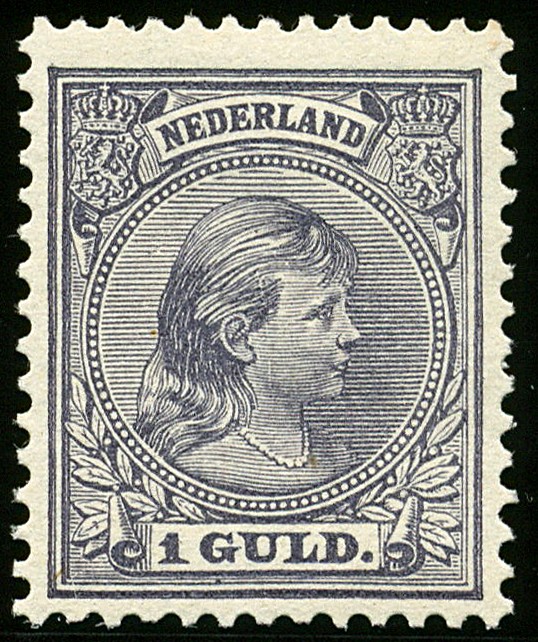 44, 1 gulden grijsviolet, miniem geoxideerd zwart puntje in de gom, ov. prachtex. met cert. NVPH (2013) € 5500
