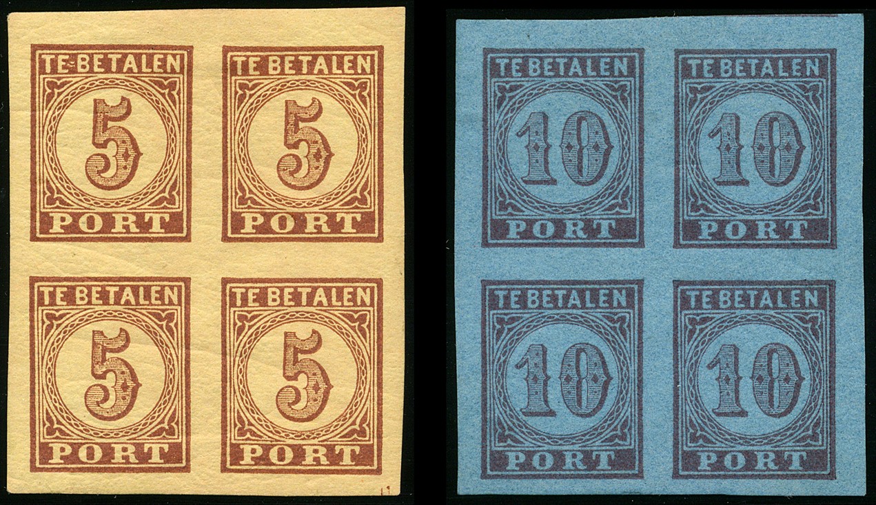 1A en 2, 5 cent bruin op oranje en 10 cent karmijn op blauw in zeer breed gerande, ongeperforeerde luxe blokken van vier met volle originele gom, sedert de NVPH editie 1991 beschreven als proeven, die door J.B. Moens uit Brussel in de jaren 1870-1875 in de handel zijn gebracht. Desondanks zijn het zeldzame blokken, en zeker in deze kwaliteit. Beide blokken met verouderd certificaat Koopman (1977)