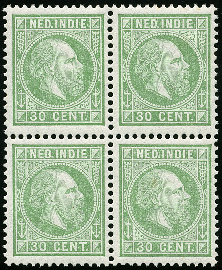 14K, 30 Cent groen, postfris blok van vier met volle, originele gom, zegel rechtsonder az. miniem bruin puntje, overigens prachtex. € 1400