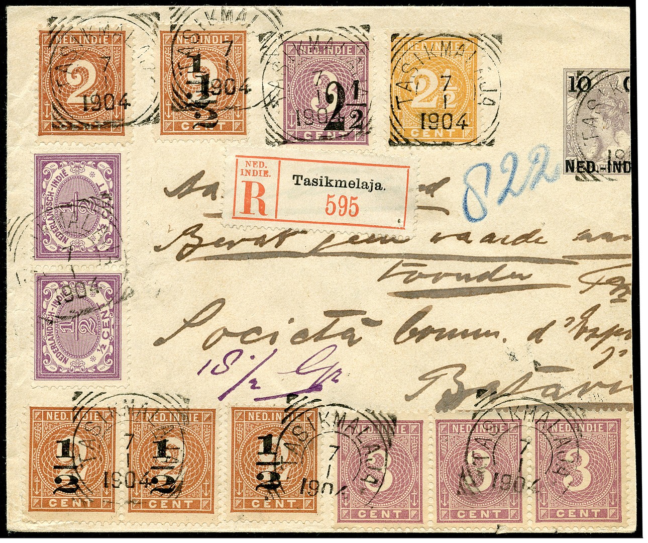 38f, ½ Cent op 2 cent met variëteit ´Dubbele opdruk´ op rechts te kort afgeknipte envelop van 10 cent met tevens nrs. 18, 19, 20 in strip van drie, 38 (3x), 39 en 40 in paar, afgestempeld Tasikmalaja 7-1-1904, R-strookje gespeld Tasikmelaja. € 200