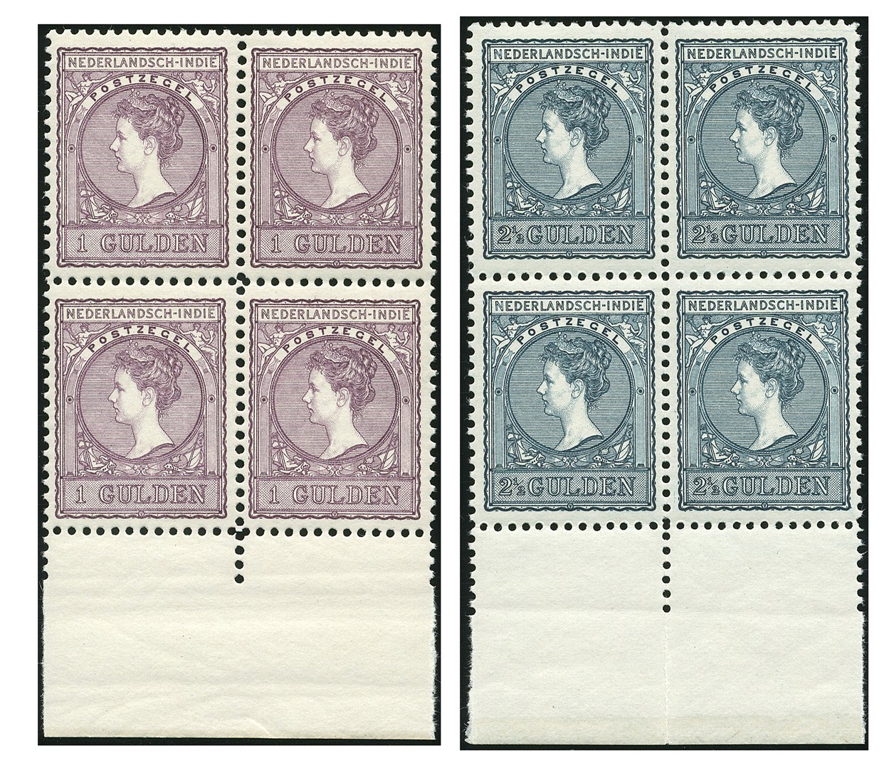 58A, 59C, type Veth, 1 gulden in lijntanding 11 en 2½ gulden in lijntanding 11½ x 11, postfrisse pracht blokken van vier met velrand. € 2500