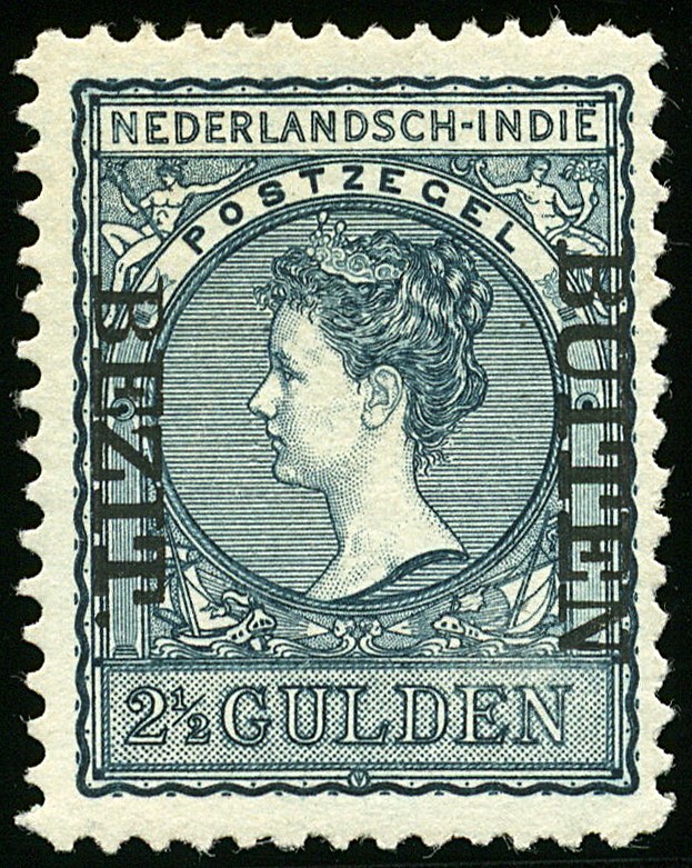98f, 2½ GULDEN ZWARTBLAUW MET KOPSTAANDE OPDRUK BUITEN BEZIT, LUXE GETAND EN GECENTREERD EN ABSOLUUT POSTFRIS! GROTE ZELDZAAMHEID! CERTIFICAAT NVPH (1966) (van Dieten veiling 507 kavel 544) € 6750