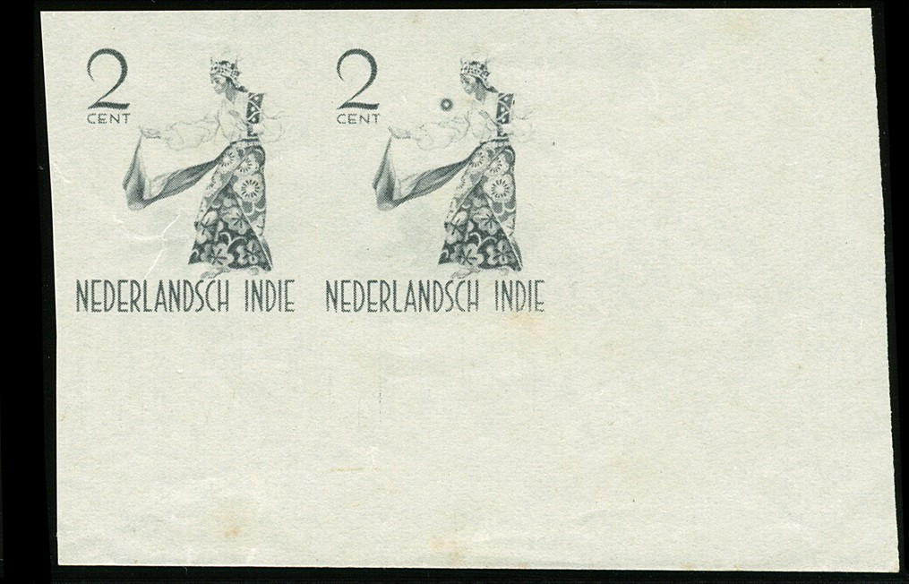 298, Inheemse dansers, 2 cent Menari danseres, vrijwel pracht ongetande en ongegomde kleurproeven in grijs (hoekparen in grijs en lichtgrijs zonder achtergrond) en rood (hoekparen in rood en lichtrood zonder achtergrond), de hoekzegel van de lichte druk vertoont als opmerkelijke plaatfout ´een ronde bol boven de arm´