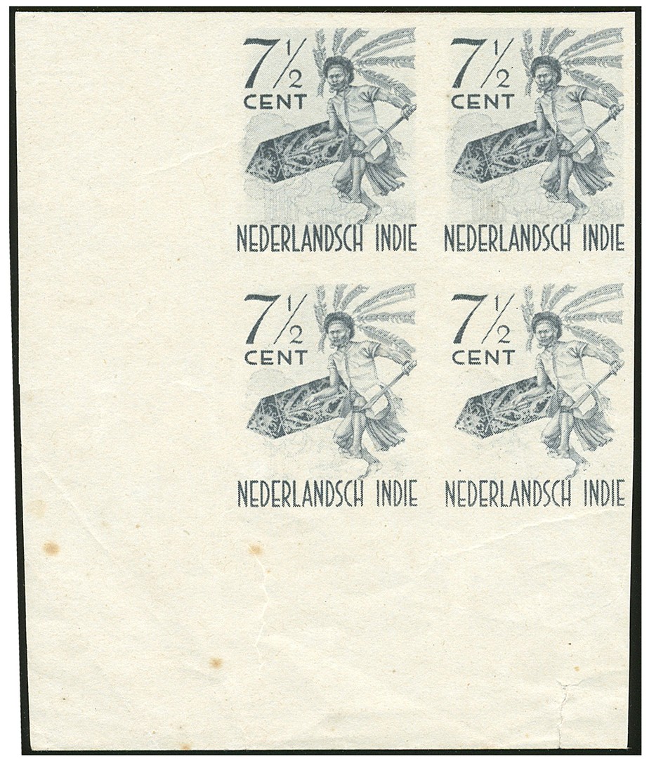 299, 302/303, 335, Inheemse dansers van 2½ cent roodviolet (randblok met oplageletter A), niet uitgegeven waarde 3½ cent lichtgrijs (randblok van vier), 4 cent groen (randblok van vier met oplageletter A), 5 cent lichtgrijs (randblok van vier) en 7½ cent lichtgrijs (hoekblok van vier), alle vrijwel pracht ongetande en ongegomde kleurproeven