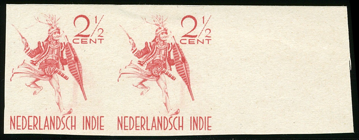 299, Inheemse dansers, 2½ cent danser uit eiland Nias, vrijwel pracht ongetande en ongegomde kleurproeven in lichtrood zonder achtergrond (randpaar), lichtgrijs zonder achtergrond (randstrip van drie) en sepia (hoekstrip van drie)