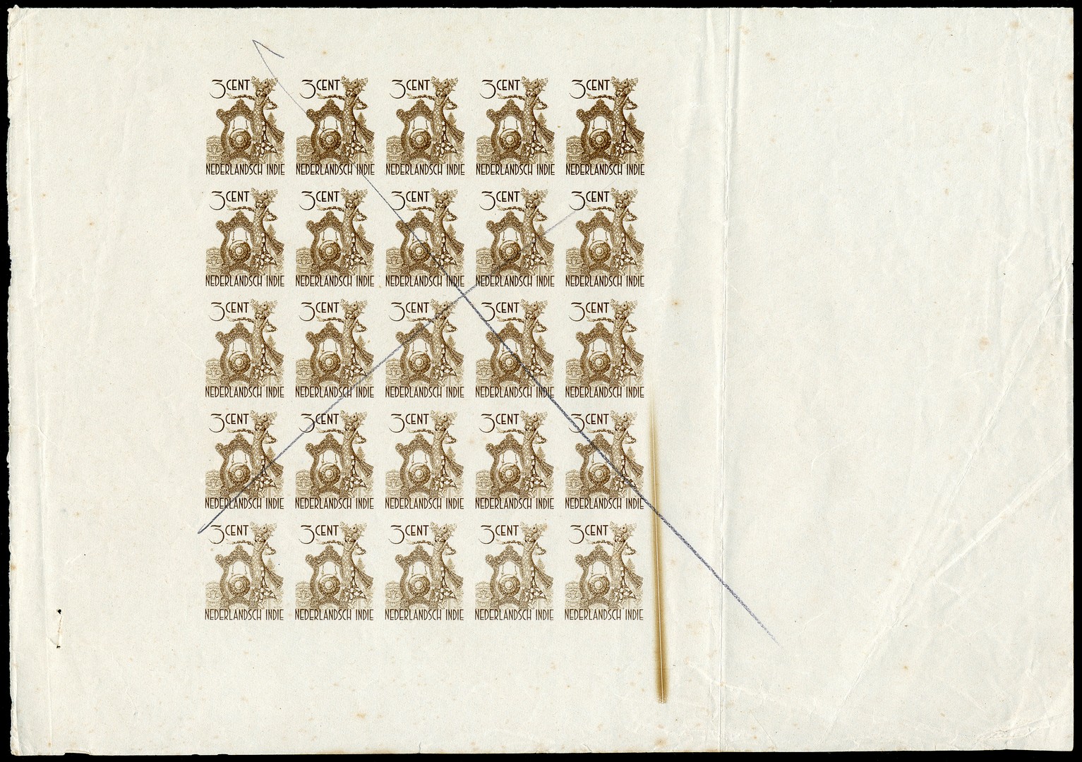 300, Inheemse dansers, 3 cent Legong danseres uit Bali, vrijwel pracht ongetande en ongegomde kleurproef in sepia zonder achtergrondbedrukking van donker naar licht, in velletje van vijfentwintig ex. met potloodkruis (dus afgekeurd)